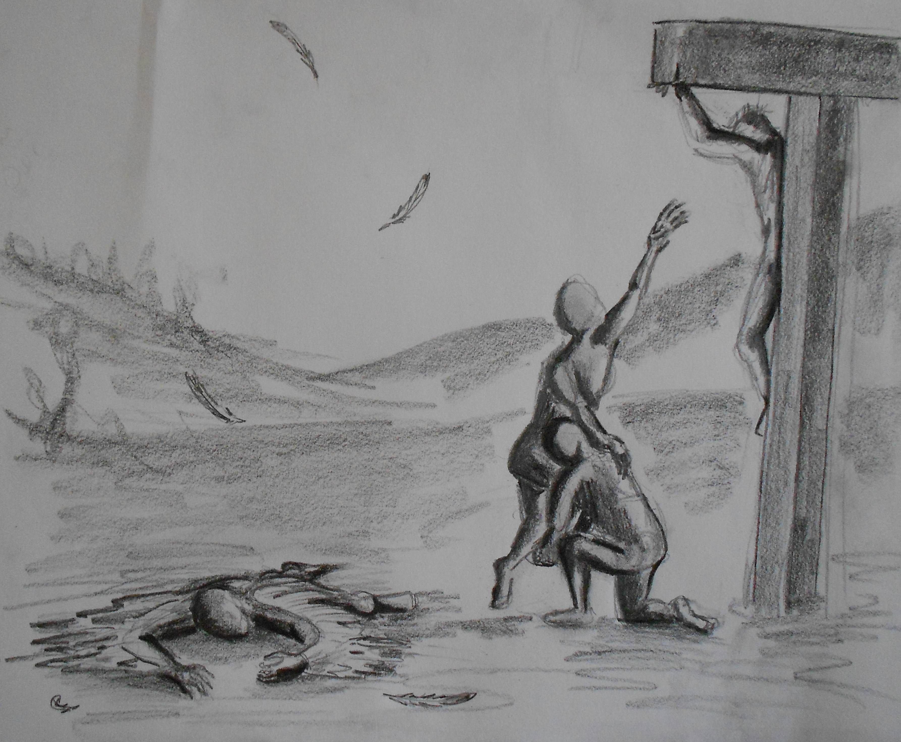 Juxtaposed to the Icarus figure is a scene of the crucifixion. Jesus is hanging on the cross, while two figures on the ground work together to reach him. This cooperation is what God desires of us. It is in helping others grow closer to God that we, ourselves, are able to grow closer to Him. The kneeling figure is providing a step up for the other figure to reach for their Savior, making himself last. We each must move over, giving everyone else priority over ourselves, in order to be genuinely good and honestly compassionate.