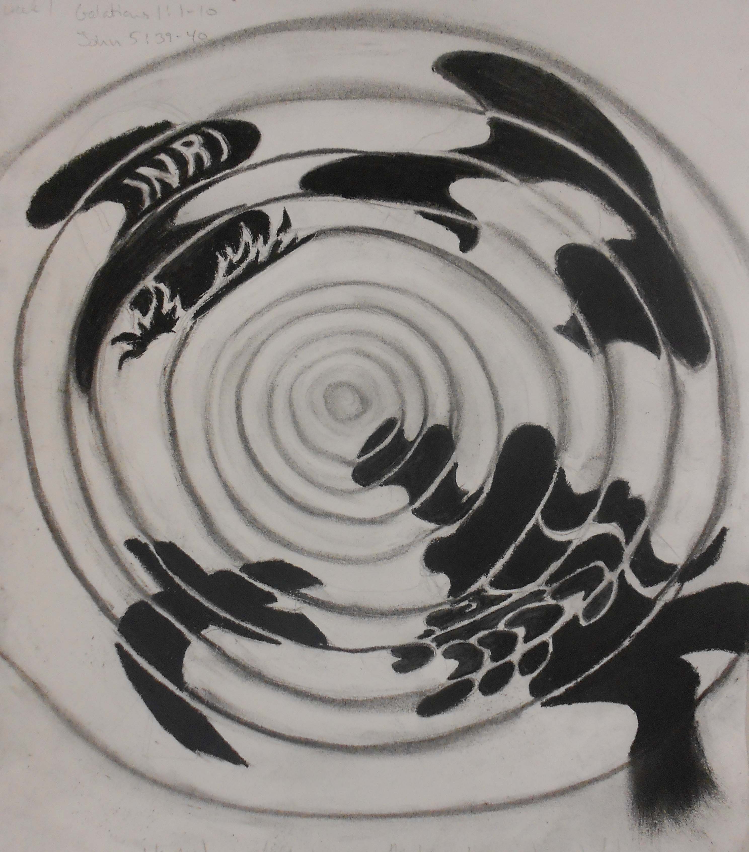 In today’s drawing, I created four icons to represent the Gospel of Jesus; a cross, a tombstone with INRI (Latin acronym for Jesus, King of the Jews), an empty tomb, and Jesus in human for with an outstretched hand. This represents the cycle of Jesus’s life and purpose; life-death-burial-Resurrection-life. Concentric ripples distort these images until they’re hardly recognizable.