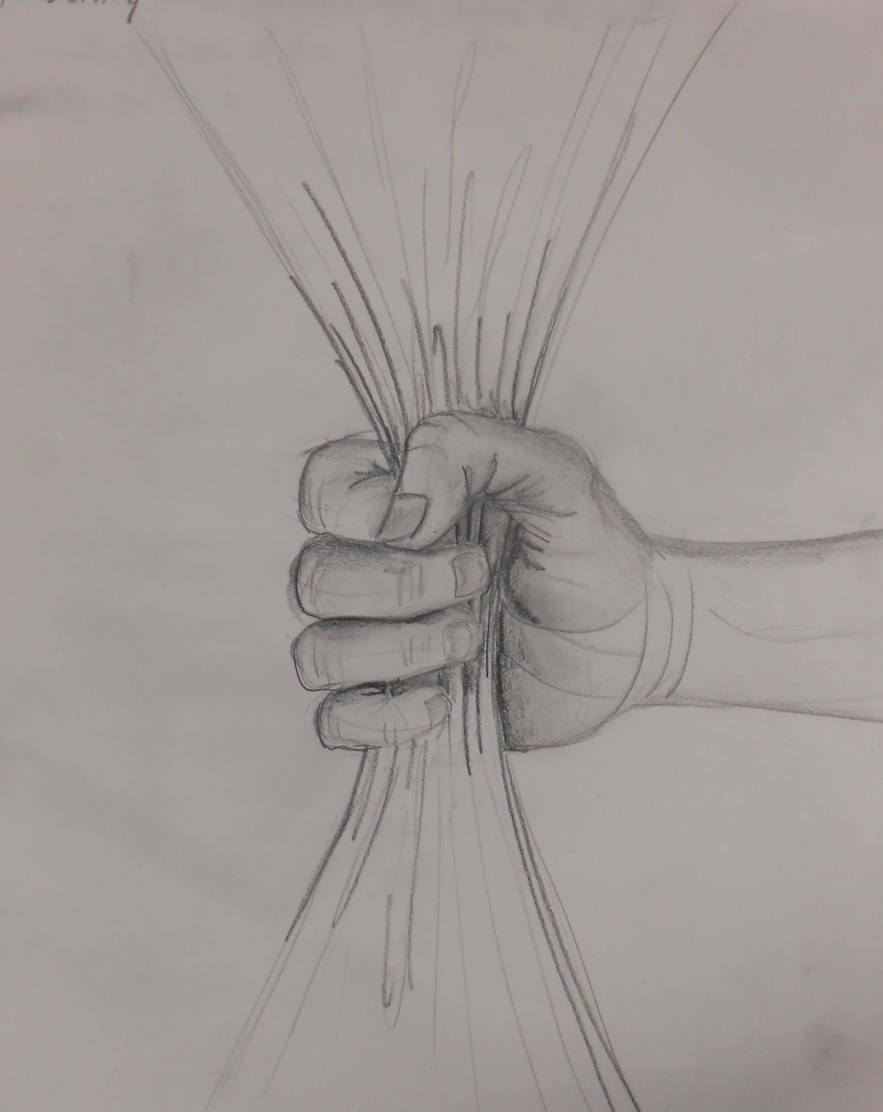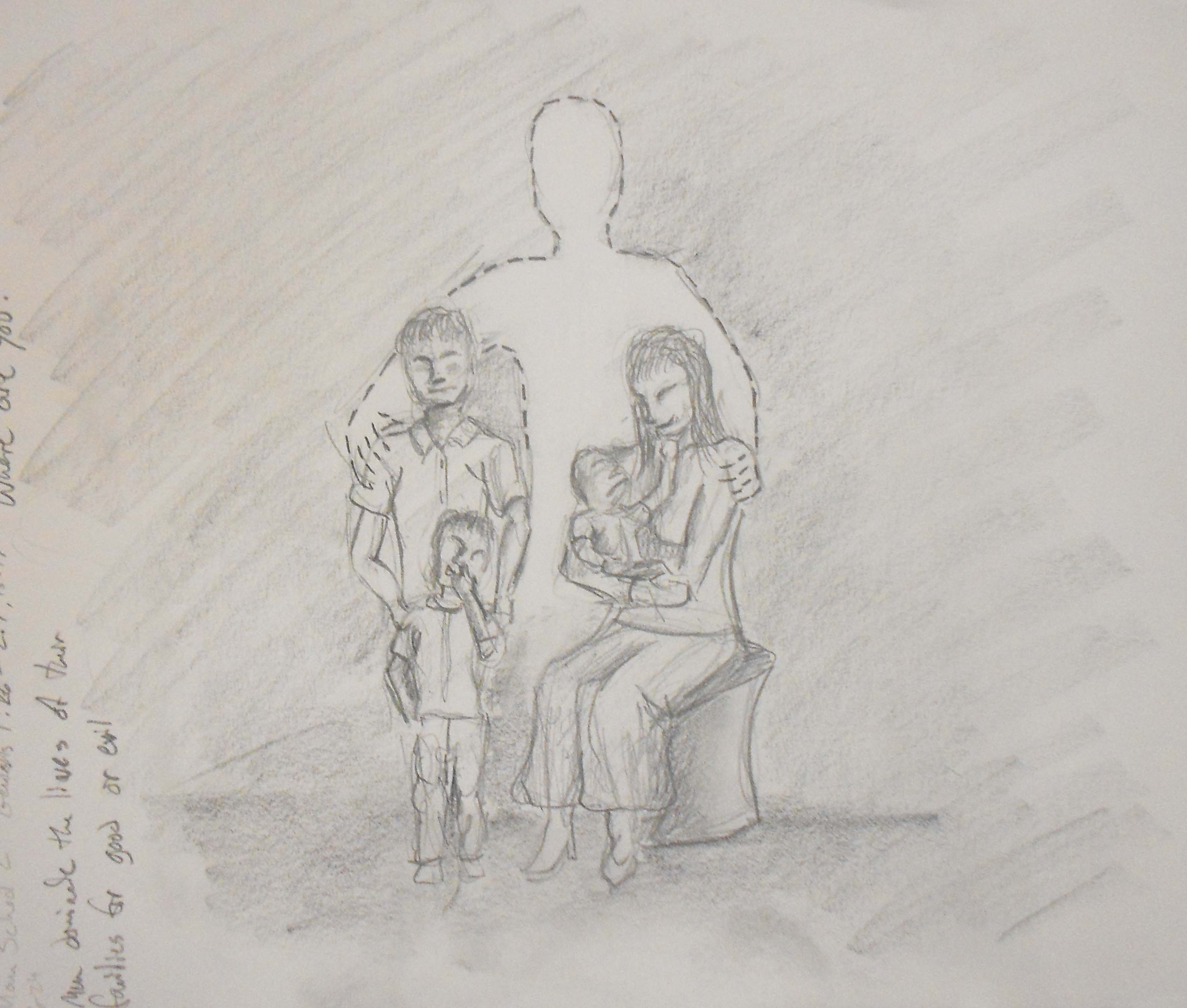 I have titled today’s drawing “Where Are You?”, a question the image poses to every father. The drawing is a universal family portrait. It is a family of three, the youngest child a baby, to reflect my family and remind myself of my place in the day’s lesson. The mother and children are shaded with details as if the drawing is the beginning of a commissioned family portrait. The father, however, is an empty space surrounded by dashed lines. One could read this like a cut-out template for a paper doll or the outlined space waiting for a sticker in a children’s puzzle magazine. Either way, the family is incomplete with the father figure being a gaping hole, desperate to be filled. With that haunting of emptiness, I pose the question to you father’s, where are you?