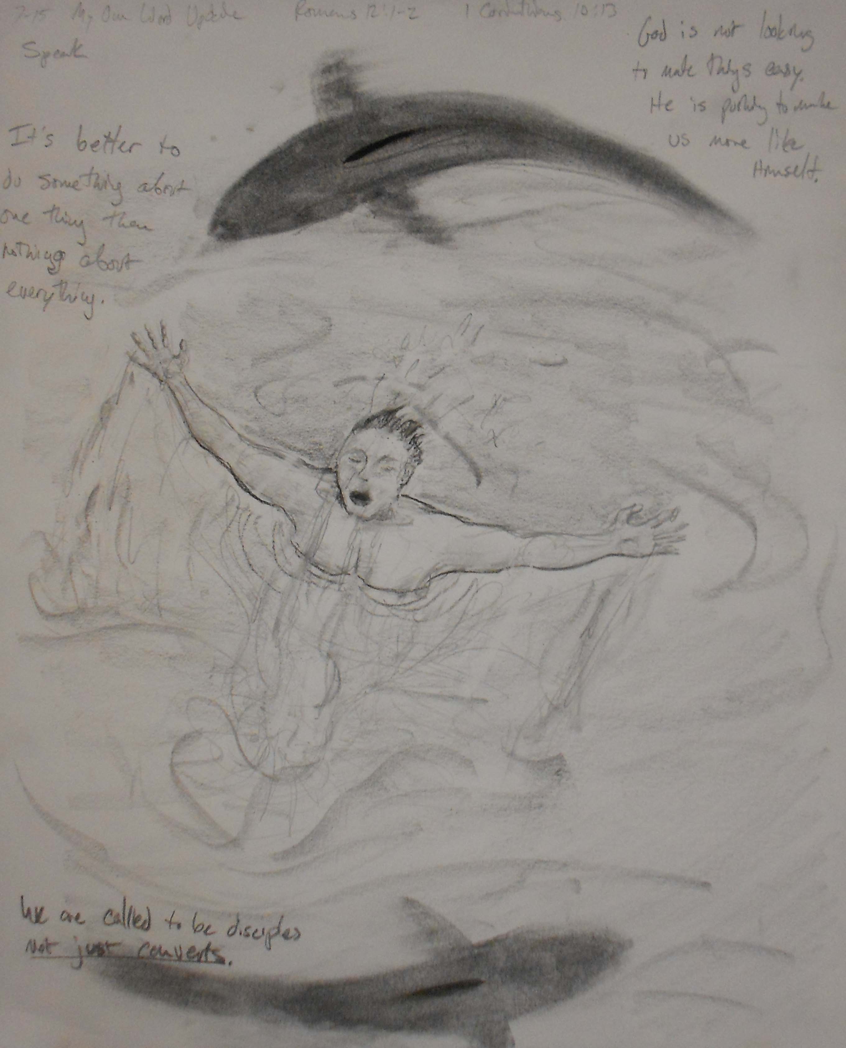 Selecting my new word is the first avenue of inspiration for today’s drawing. Realizing where I wanted to focus my boldness felt like release in my spirit, symbolized by the figure breaking through the water’s surface. The expression on the figure’s face shows relief, despite the shadowy figures circling around him. The shadows represent the situations that arise to test our commitment to bettering ourselves, temptations to abandon our goals, and the premature pride from thinking minor victories means we’ve arrived. Deciding to make positive changes in your life with God’s help does not mean the task will be easy, in fact it means the opposite. God will teach you the characteristic selected with My One Word by placing you in situations that require using that quality. It can really be quite frustrating! Are you wanting to be more patient? Expect to face situations that will test your patience. Is your goal to be more honest? Expect hard questions and to give hard answers with increased frequency. My word brought opportunities to take on new risks by stepping out on my own. With my new focus, I am expecting more instances to share my ideas, though it’s not always the most popular. (I had to choose this during an election year….DOH!) God is not looking to make things easy, He is pushing us to become more like Him.