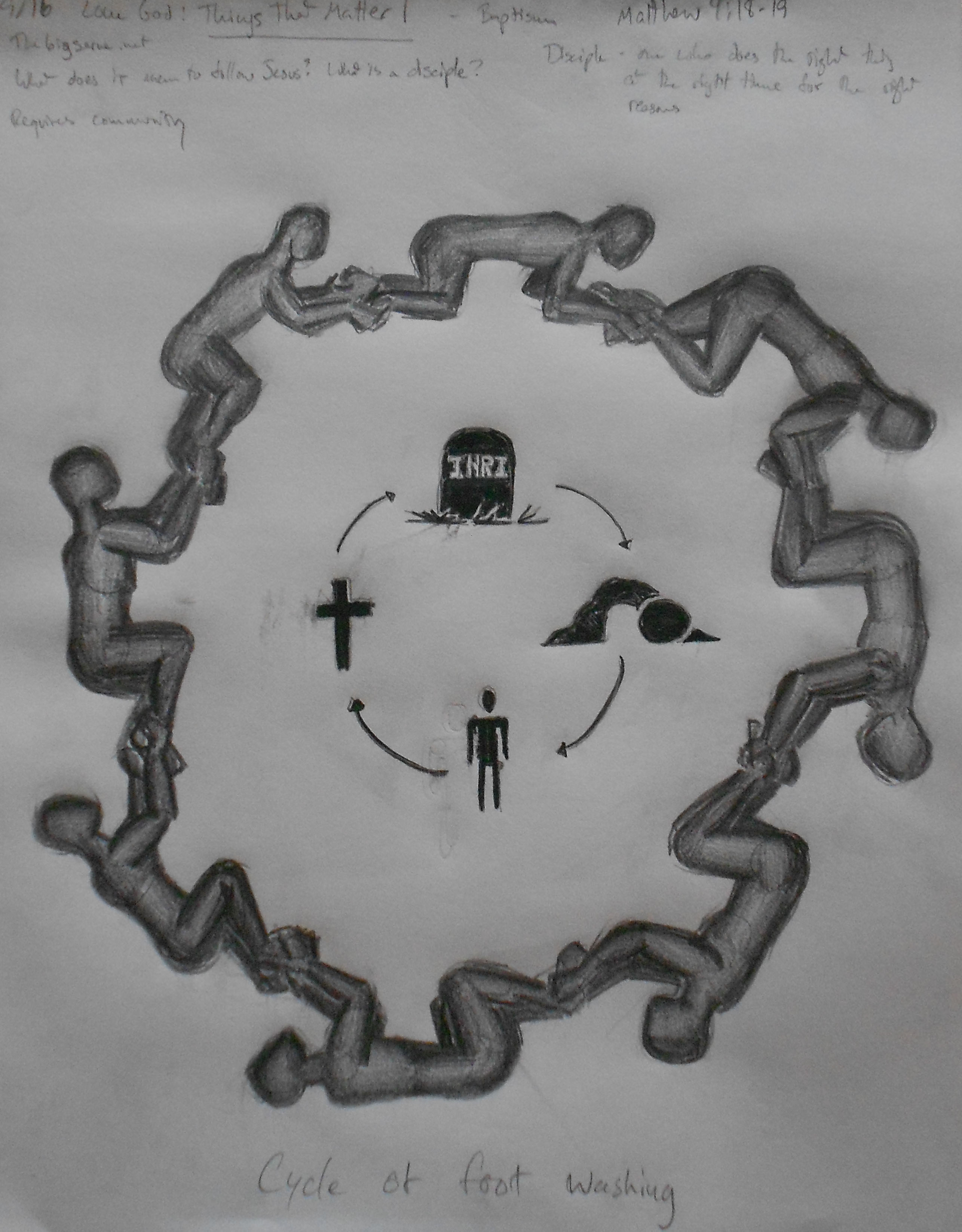 Today’s drawing is a depiction of the Bible’s ultimate representation of servant-hood, washing another’s feet. 2000 years ago, walking was the most common form of transportation and the closest thing to Lebron James’s shoe line was some raw hide and leather straps (wait, that’s not so different). At any rate, the first century common citizen had nasty feet. Even today, showing the bottom of one’s foot to another in middle-eastern society is tantamount to flipping the bird in America. Just before giving himself over for torture and crucifixion, Jesus exemplified humility to his disciples by washing each one of their feet. The central focus of today’s drawing is the icon of the Gospel you may recognize from some previous drawings. The summation of the Gospel is simply this; Jesus lived, He died on the cross, He was buried, and He rose from the grave. Surrounding the Gospel icon is a circular arrangement of figures, each washing the feet of the one in front of them. You may remember from a couple weeks ago, this arrangement implies the Gospel is the central focus of the action surrounding it. In today’s image, it is the motivator for humbing ourselves and serving others.
