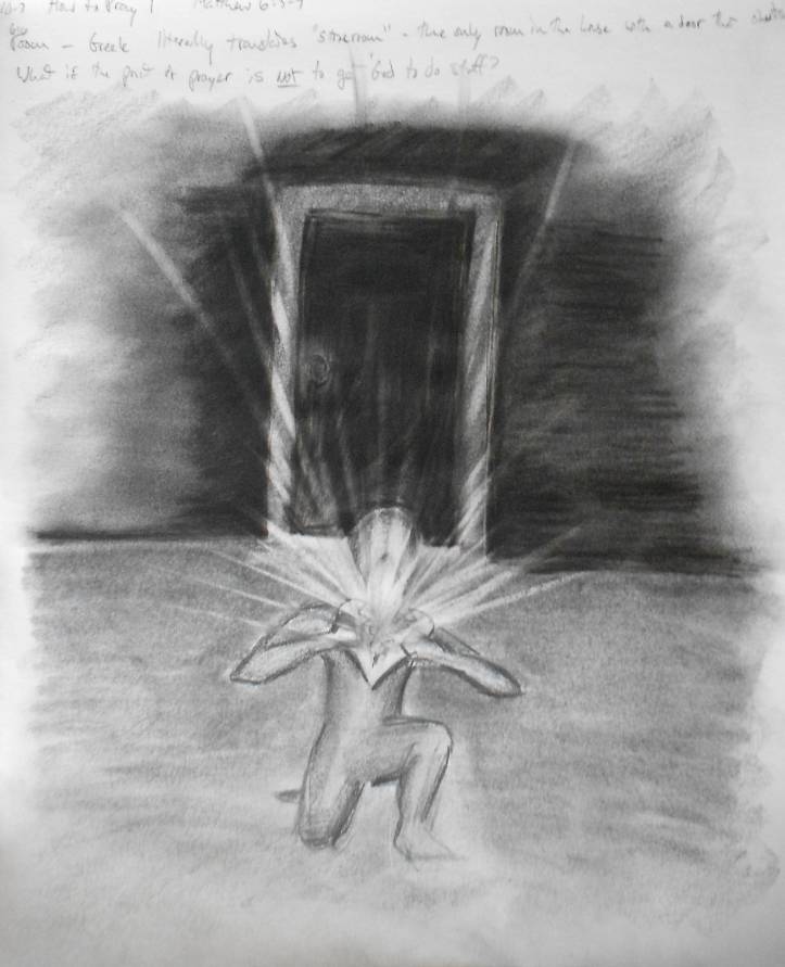 I’ve interpreted today’s message in a literal drawing. The figure is closed in a room, obvious by the closed door in the background. The darkness implies solitude, the figure is closed in the room alone. As the figure kneels, it throws its head heavenward and grasps its chest in Superman fashion, opening its soul. Further inspection of the image reveals the figure is tearing its own heart open. The bright rays of light explode from the figure’s core in a vulnerable surrender of its total being.