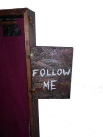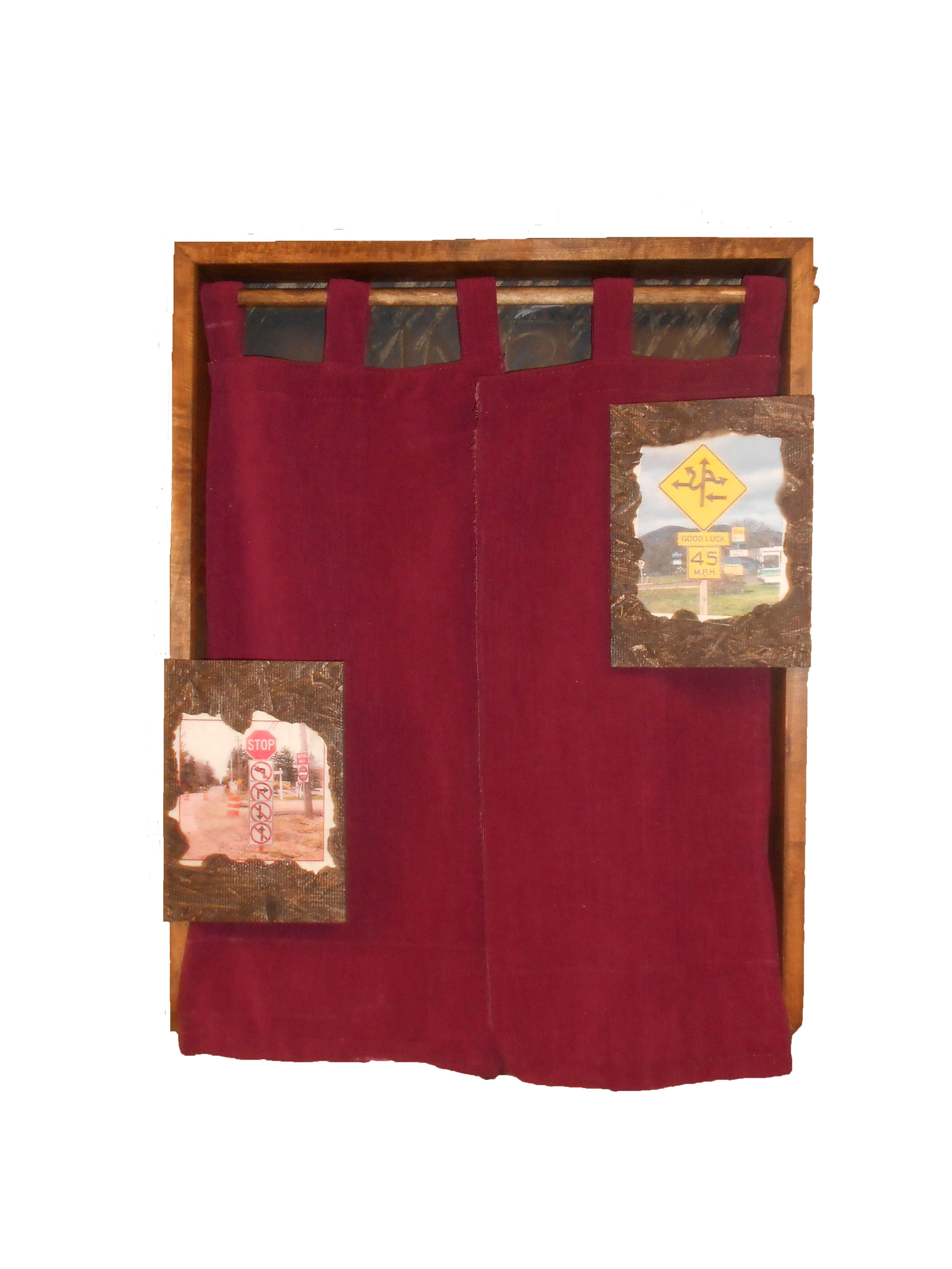 Religion – When first approaching the piece, the image represents religion. It is not indicative of any specific religion, I am representing religion in general. The piece extrudes itself from the wall where it hangs as if it is reaching out to each passer-by, craving their attention. Once a viewer’s attention is capture, they see the shadow box wall hanging is very closed. Two wooden panels are the first attributes than grasp the eye’s attention. Each made of rough OSB plywood, camouflaged to match the smooth rails that frame in the piece using the same dark wood stain. These two panels embrace a heavy curtain, protecting it from tampering hands and minds. The curtain stands stoically protecting the internal image, much like religion covers the heart of faith and conceals the mission of the church.