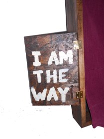 Turning over the ‘Stop’ panel exposes the words ‘I AM THE WAY’, the starting phrase of  John 14:6. Thomas, one of Jesus’s disciples known for his insecurity, was quite disturbed when Jesus foretold his impending death. Jesus stated he was going to prepare a place for his disciples, a place they already knew how to reach. Thomas reacts by asking, “Lord, we don’t know where you are going, so how can we know the way?” Jesus answers “I am the way, the truth and the life. No one comes to the Father except through me. If you really know me, you will know my Father as well. From now on, you do know him and have seen him.”