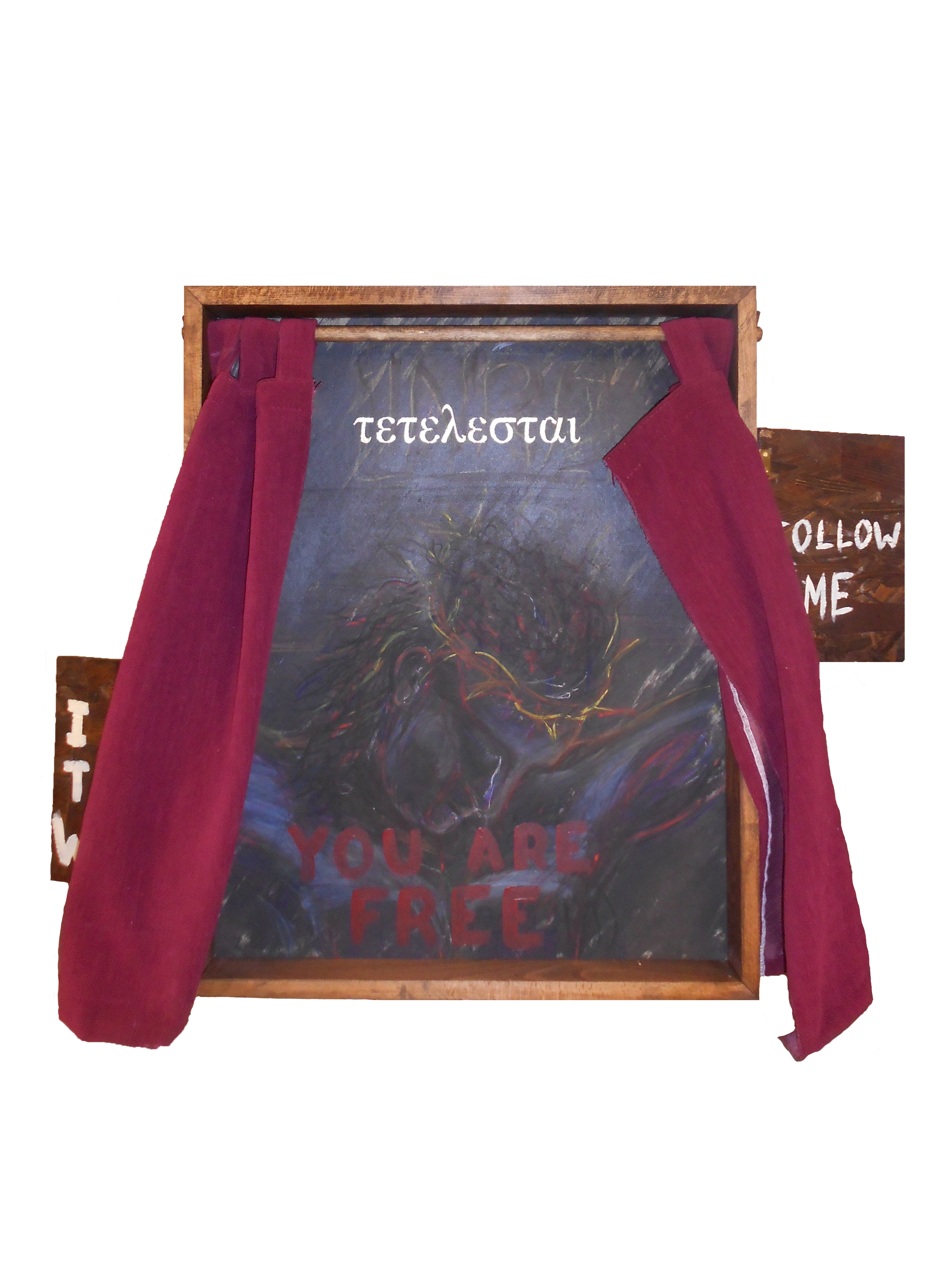 At this point of the piece, the viewer is free to pull back the torn curtain and expose the image behind. The focal point is the bowed head of our deceased Messiah, one final tear glistening as it slides down his lifeless nose.