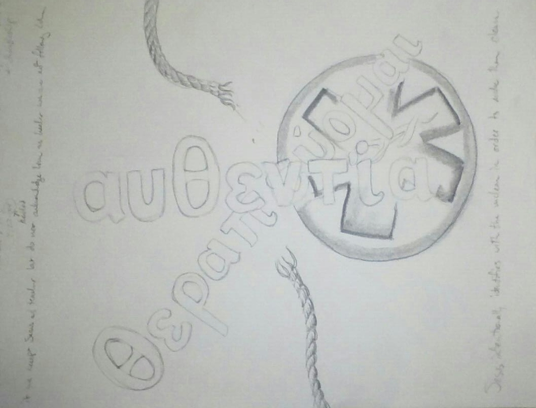 Today’s drawing is very personal to me. It is also quite simple, two words and an icon. Across the page, in the foreground, is the word ‘authority’ written in Greek. Jesus holds supreme authority over the earth and all its inhabitants. The middle ground hold a second word, ‘healed’, also written in Greek. The icon in the background is the medic-alert tag I no longer have to wear, and the broken chain that once suspended it on my neck. This December I will celebrate ten years without seizures or anti-convulsion medication because Jesus identified with me.