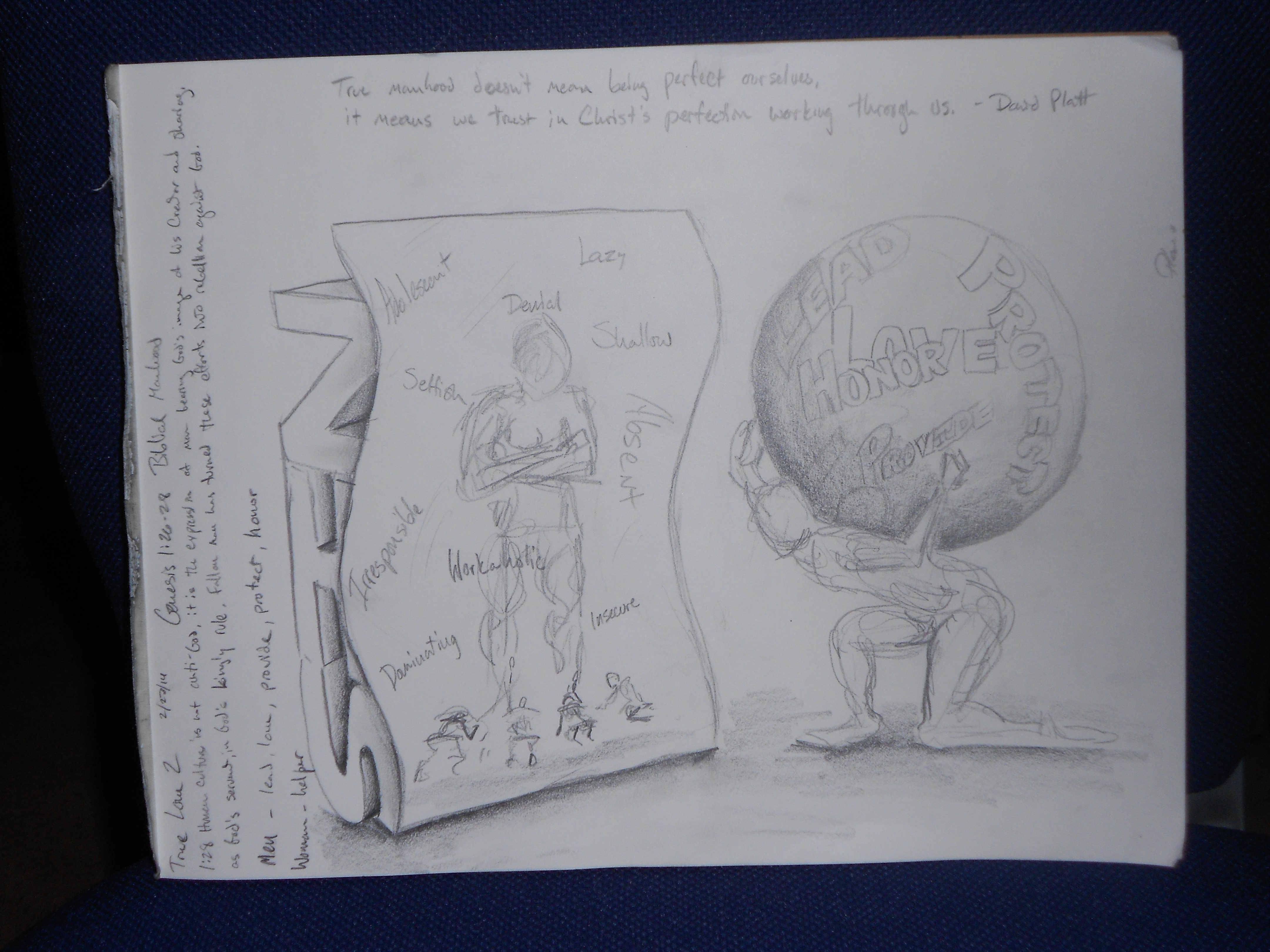 Today’s opening image is a sculpture of Atlas literally carrying the weight of the world on his shoulder. The primary role of Atlas in Greek Mythology was to be the force that held the earth steadfast within the galaxy. Husbands, dads, men, this is precisely our job in the home. One of our roles is to hold our world in place within the realm of life, whatever needs to happen to keep the family going, that’s your job. Every man pictures himself in this position at some time, successfully carrying the weight of the world on his shoulders. Strength, integrity, honor, these are the top qualities of manhood every guy claims (but few actually own). Inside the “world” the Atlas figure carries are characteristics of Biblical manhood.