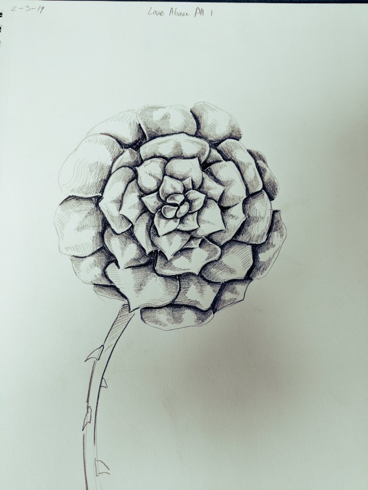 We began a new sermon series at Journey today, Love Above All (Valentine’s themed). I was behind the drum kit this morning, which usually means more time to draw, from having two rounds of the sermon during which to draw. This morning was a bit different. We began taking advantage of the first service to have a small group Bible study discussion as the worship team, second service included a housekeeping conversation inspired by a budget meeting from the previous week. Following the pastor’s sermon outline for our discussion, this image of a blooming rose stayed in the front of my mind.